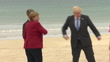 CLEAN: Exterior shots of British Prime Minister Boris Johnson and wife Carrie on Carbis Bay Beach and welcoming the Chancellor of Germany Angela Merkel and husband Joachim Sauer to the G7 Summit on 11th June 2021 Carbis Bay, United Kingdom.