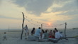 Wide shot of family and friends hanging out and relaxing on beach blankets and taking pictures of the sunset during beach vacation