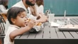 A little boy enjoys eating a grilled cheese sandwich while dining outdoors with his family on the patio of a casual restaurant. As he eats the sandwich, his parents share a quesadilla appetizer.