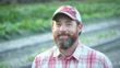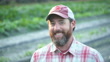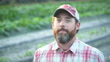 Headshot of a farmer standing in a field of newly planted crops, on a small, family owned farm. He is a mature man in his 40s with a thick beard, wearing a plaid shirt. He is looking down with a serious expression, puts on a cap, and then smiles at the camera.