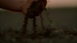 Super slow motion close up shot of an unrecognizable farmer scooping and examining dirt in a rural, plowed field at sunset.