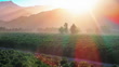 Farming, mountain and sunset vineyard with biodiversity, agro development and permaculture landscape. Nature, growth and eco valley for sustainable agriculture, natural resources and organic crops