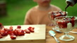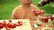 Father Pouring Chocolate Sauce in Bowl of Vanilla Ice Cream and Strawberry Slices For Adorable Son. Close-Up of Man Making Dessert For Boy at Table in Backyard.