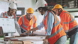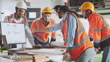 Female engineer lead team meeting, work together in factory with technician coworker on layout blueprint and laptop computer. Engineering industry business, industrial job, or people at work concept