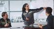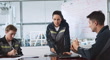 Female team leader lead group of engineer, work together in robotic machine factory meeting room. Engineering industry business, industrial job people, robot crane technology in manufacturing concept - 4K Stockvideo