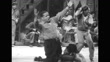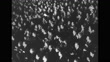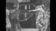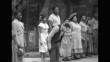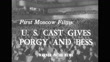 Title: "First Moscow Films: US Cast Gives Porgy and Bess" superimposed on a full theater, voiceover in Russian / The set portrays a lower-class neighborhood as the performers sing / audience applauding / A man on his knees singing, gesturing, with dancers behind him / Men carry a rolled fishing net; the singer embraces two children / audience / The singer runs to the edge of the stage and takes a bow with the others / audience / Note: exact day not known