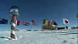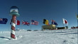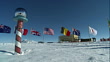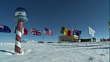 MS Flags waving in wind around the ceremonial South Pole with Amundsen-Scott South Pole station in background / Antarctica - HD Stockvideo