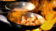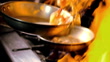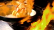 Flames burn under a frying pan filled with shrimp.