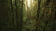 Flyover view approaching trees with moss in peaceful dense forest / Forks, Washington, United States - 4K Stockvideo
