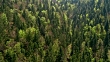 Aerial shot of the tree tops of a lush forest bathing in sunlight. Shot in Slovenia.