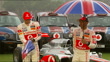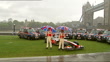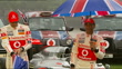 MOTOR RACING: Formula One: Lewis Hamilton in confrontation with Felipe Massa; TX 7.7.2011ENGLAND: London:RAININGHamilton and Jenson Button (Former F1 Champion) posing for photocall beneath Union flag umbrellas in front of racing car and taxis, with Tower Bridge in background