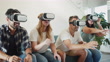Four friends are using virtual reality glasses together on the sofa at home - 4K Stockvideo