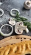A baking scene shows sliced mushrooms, fresh parsley, salt crystals, and a golden pie crust on a rustic dark wooden surface. Flour dusting adds texture, creating a warm, homemade cooking ambiance.