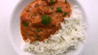 The vibrant orange Indian cuisine dish of chicken tikka masala, served with freshly steamed white basmati rice in a white ceramic dish on a table background. Freshly chopped cilantro has been sprinkled on the top as a garnish. The scene slowly rotates, shot from directly above.