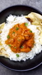 Freshly cooked chicken tikka masala served with fresh white Indian basmati rice and naan bread on a black textured ceramic dish. - HD Stockvideo