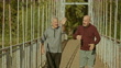 Two senior friends jogging over bridge on sunny autumn day in nature