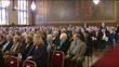 Funeral of Liberal politician Cyril Smith; ENGLAND: Rochdale:INT*** Organ music overlaid SOT ***Various of mourners gathered for funeral of Cyril Smith / Close shot of order of service / People chatting / Back view of organist / Chief mourners and clergyman climbing steps onto stageends
