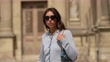 PARIS, FRANCE - APRIL 27: (SLOW-MO) Gabriella Berdugo wears black sunglasses from Prada, gold earrings, a gold large necklace, a pale blue ribbed wool long sleeves polo shirt from Dodo Baror , a beige micro cargo skirt from from Filippa K, a blue ripped LV monogram print pattern denim handbag from Louis Vuitton, black shiny leather block heels knees boots from Jonak, during a street style fashion photo session, on April 27, 2023 in Paris, France. (Footage by Edward Berthelot/Getty Images)