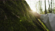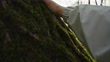This video captures a serene and magical moment as a human hand touches the mossy bark of a tree at sunset. The camera zooms in to show the intricate details of the moss and the bark, illuminated by the warm and gentle light of the setting sun. The hand gently moves along the surface of the tree