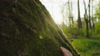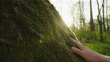 SLO MO Gentle Touch of a Human Hand on Mossy Tree Trunk at sunset - 4K Stockvideo