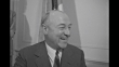 George Humphrey, Eisenhower appointee for Treasury Secretary, standing behind desk; current Treasury Secretary John Snyder walks up to him and both men sit down / CU Humphrey / CU Snyder / Snyder signing document on desk, Humphrey sitting next to him talking to him / Humphrey signing document / reporters and cameramen shooting footage stand around desk / Note: exact day not known