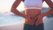 4k video footage of a young woman framing her stomach with her hands on the beach at sunset