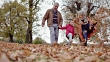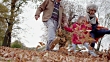 Grandparents and granddaughter kicking autumn leaves in park. MS, tilt up, real time.