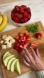A hand slicing strawberries on a cutting board - 4K Stockvideo