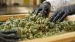Workers wearing gloves and white lab coats trimming buds at an industrial scale marijuana growing operation.