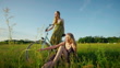Happy young female friends with a bicycle pointing away while relaxing on a grassy meadow under a blue sky on a sunny day. They enjoy the warmth and beauty of the day, sharing a moment of leisure and companionship. The clear sky and green meadow create a peaceful and joyful atmosphere, capturing their relaxed and carefree spirit.