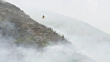 Helicopter pouring water over wildfire burning on mountainside in Utah near Deer Creek Reservoir.