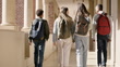 High school, backpack and students in corridor walking to class for learning, education and studying knowledge. Friends, teenagers and back of kids in hallway, group and children talking together
