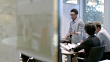 Hip young businessman leads meeting in office conference-room (dolly shot)