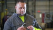 Arc shot of a mature multiracial Hispanic and Caucasian man standing in a dimly lit manufacturing warehouse with a forklift and industrial equipment in the background. He is looking at the camera with a serious expression on his face, putting safety goggles on. He is in his 40s.