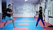 Young man and woman are practicing swording with katana, samurai sword.They are fooling around and having fun