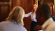 A stylish woman is standing in a hotel suite giving a sales pitch to a team of people.