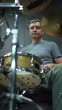 Low angle shot of a focused drummer playing the snare drum in a studio, emphasizing the drum kit and performance intensity.