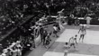 Loyola Ramblers play Cincinnati Bearcats for NCAA championship title / huge crowd of fans surround basketball court / CU of floor sign stating, 'FINALS NCAA 1963' / Bearcats dominating play / cheerleader clapping and cheering / Jerry Harkness scores / players run from one end of the court to the other as the two teams try to score / Loyola scores / cheerleaders jump and cheer. Loyola Ramblers win NCAA basketball championship against Cincinnati Bearcats on March 23, 1963 in Louisville, Kentucky (Footage by Getty Images)