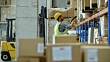 Wide handheld shot of a male employee scanning the packages in the warehouse. Shot in Slovenia.