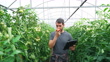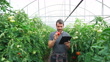 Dedicated young man farmer having a video call with a customer or business partner about the tomato production. He is using a tablet while walking among the plants in the greenhouse. Slow motion scene.