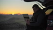 Male farmer using laptop at SUV in rural field at sunrise - 4K Stockvideo