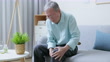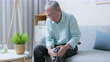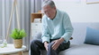 asian elder man holding his knee and suffering joint pain at home