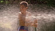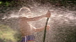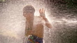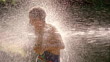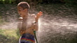Medium shot boy in swimming trunks holding water hose getting sprayed with water / New York - HD Stockvideo