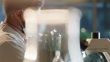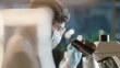 Microscope, night scientist and lab research with medical job, science and molecule analysis. Doctor, biotechnology and professional man in hospital with virus studying with mask and ppe equipment - 4K Stockvideo