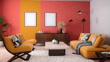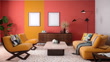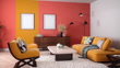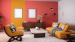 Living room interior featuring bold color-blocked walls in peach, yellow, and orange. Furnished with mustard yellow seating, geometric throw pillows, and a terrazzo coffee table.