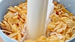 Slow motion close up handheld shot of milk being poured onto the breakfast cereal. Shot in Slovenia.