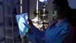 Modern Hospital Medical Research Center: Diverse Colleagues Gathered Around Interactive Screen hologram for data Of Brain On Display. Three Doctors Discussing Innovative Brain Tumor Treatment - 4K Stockvideo