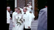 A montage of a bride and groom leaving a church after getting married. Rice is thrown by friends and family. - HD Stockvideo