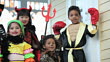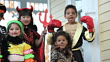 MS PAN Multi-ethnic group of children dressed in Halloween costumes standing on porch / Richmond, Virginia, USA - HD Stockvideo