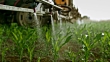 Slow motion close up handheld shot of the nozzles on the boom sprayer on the back of the moving tractor spraying liquid on the corn crops in sunshine. Shot in Slovenia.